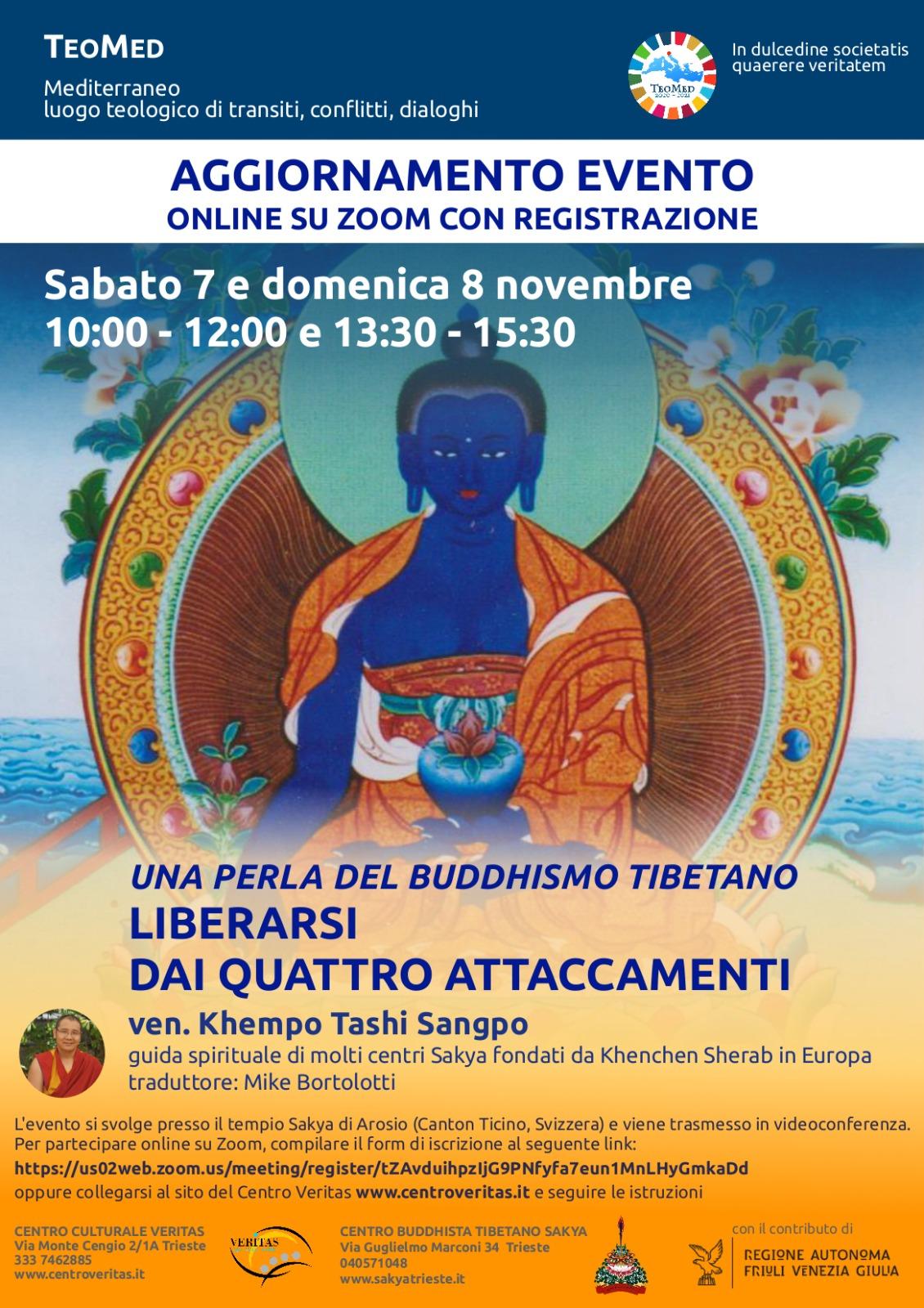 “Liberarsi dai quattro attaccamenti” comprende gli insegnamenti essenziali su come intraprendere in modo genuino la pratica del Dharma andando al cuore stesso del sentiero. Questo insegnamento fu ricevuto da Sachen Kunga Nyingpo (1092-1158) direttamente da Manjushri ed è considerato essere una delle perle del Buddhismo tibetano. I quattro versi radice includono l’essenza del Dharma:
