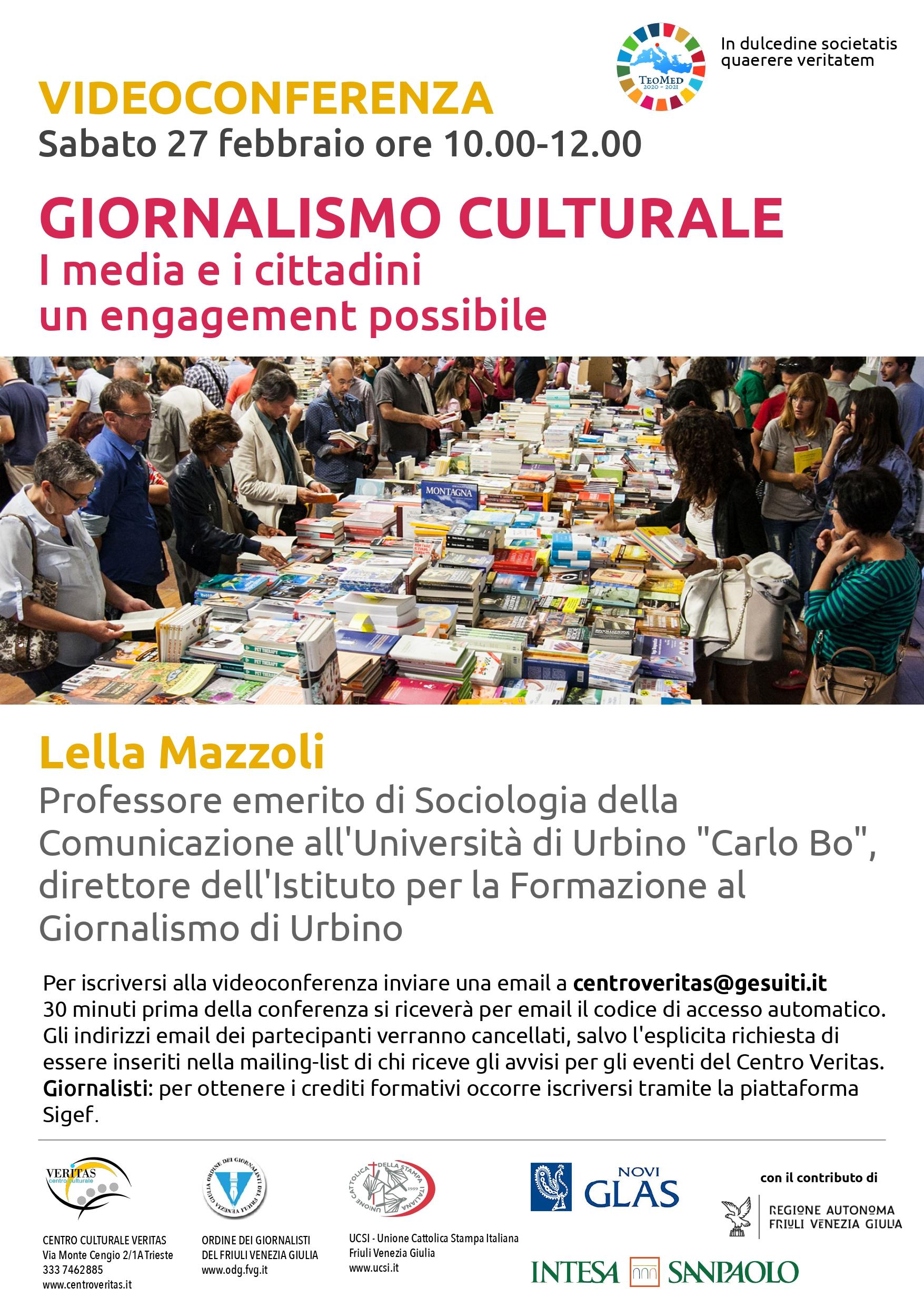 Sabato 27 febbraio alle 10, videolezione sul GIORNALISMO CULTURALE. Ne tratterà Graziella Mazzoli (sociologa, scrittrice, docente universitaria e alla guida dell’Istituto di Formazione Giornalistica di Urbino, direttrice del festival del giornalismo culturale).