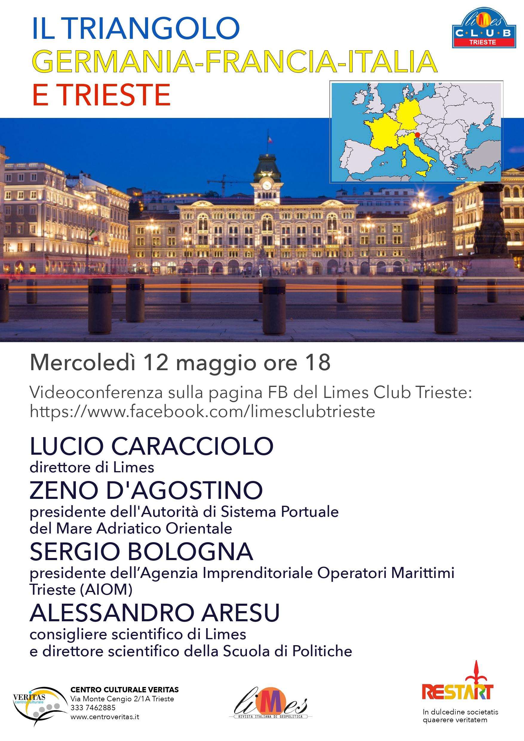 Il TRIANGOLO GERMANIA-FRANCIA-ITALIA e TRIESTE 1 Maggio 20217 Maggio 2021 Luciano Larivera Mercoledì 12 MAGGIO ORE 18 -IL TRIANGOLO GERMANIA-FRANCIA-ITALIA (E TRIESTE) con Lucio Caracciolo, Zeno D’Agostino, Sergio Bologna – Evento on line: collegarsi alla pagina del Limes Club Trieste