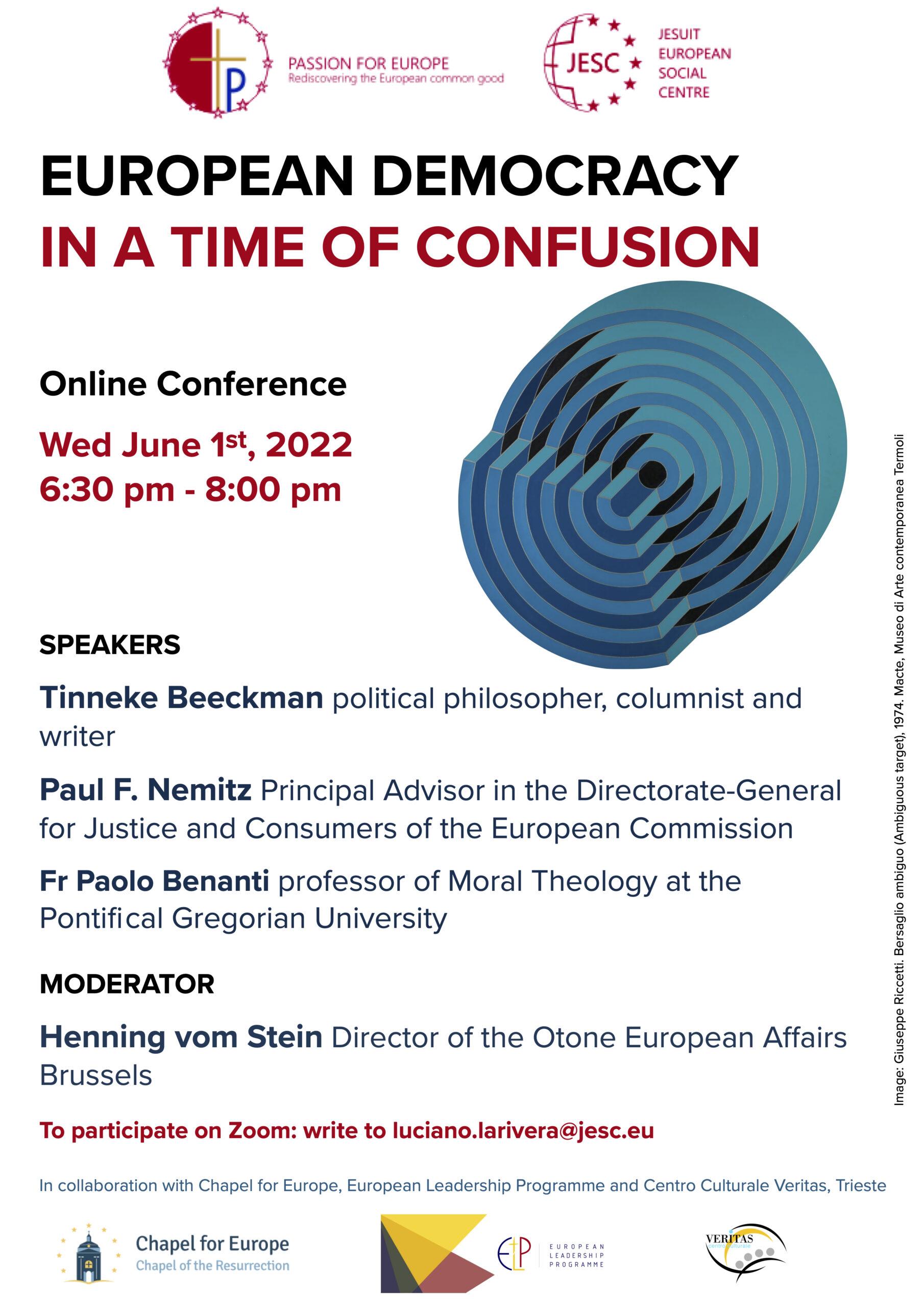 La conferenza online in inglese, dal titolo EUROPEAN DEMOCRACY IN A TIME OF CONFUSION si terrà il 1° giugno alle 18.30-20.00. Si tratta di un webinar organizzato dal gruppo “Passion for Europe” e dal Jesuit European Social Center di Bruxelles, con il contributo del Centro Culturale Veritas di Trieste.