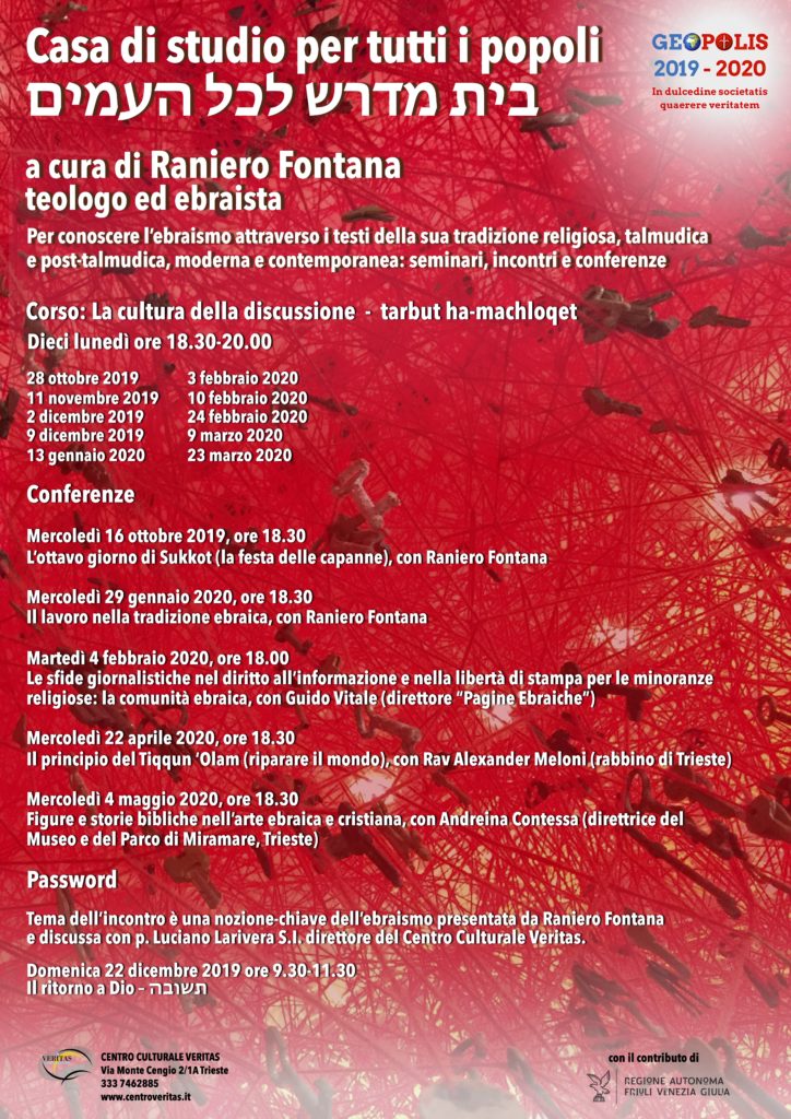 Ricordiamo che lunedì 11 novembre dalle ore 18.30 alle 20.00 presso la sala del Centro Culturale Veritas si svolge il secondo incontro del corso “La cultura della discussione: lezioni talmudiche” con Raniero Fontana, teologo ed ebraista.