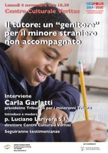 Lunedì 4 novembre alle 18.30 presso il Centro culturale Veritas di Trieste (via Monte Cengio 2/1A) si terrà la conferenza dal titolo “Il tutore: un ‘genitore’ per il minore straniero non accompagnato”. Interverrà Carla Garlatti, presidente del Tribunale per i minorenni di Trieste; e seguiranno alcune testimonianze.