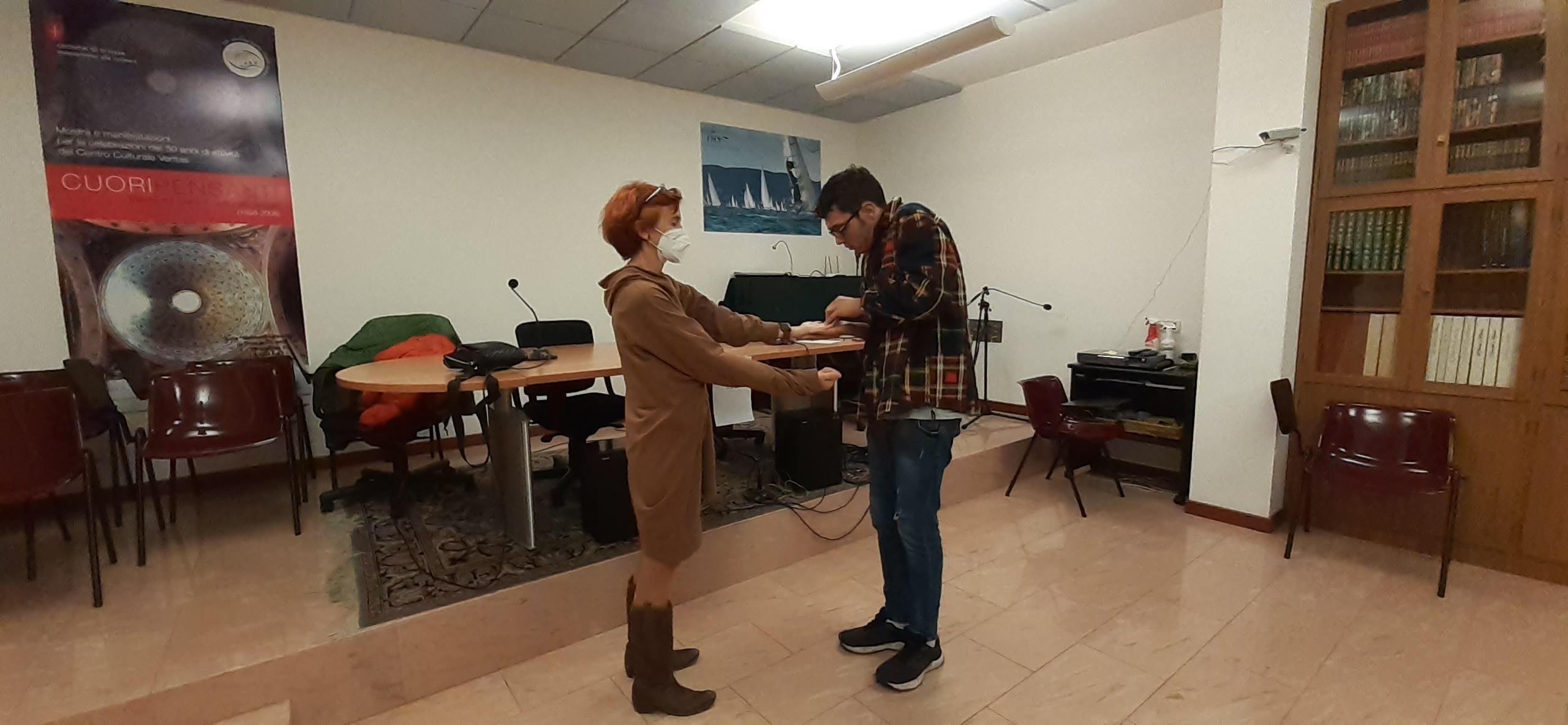 Marco Tortul, regista, educatore e coach e Manuel Covra, attore, hanno esordito con un quadro scenico in cui è stato protagonista l’equilibrio. Manuel ha camminato sul palcoscenico con un grosso libro sulle spalle ed allo stesso tempo ha declinato parole in libertà.